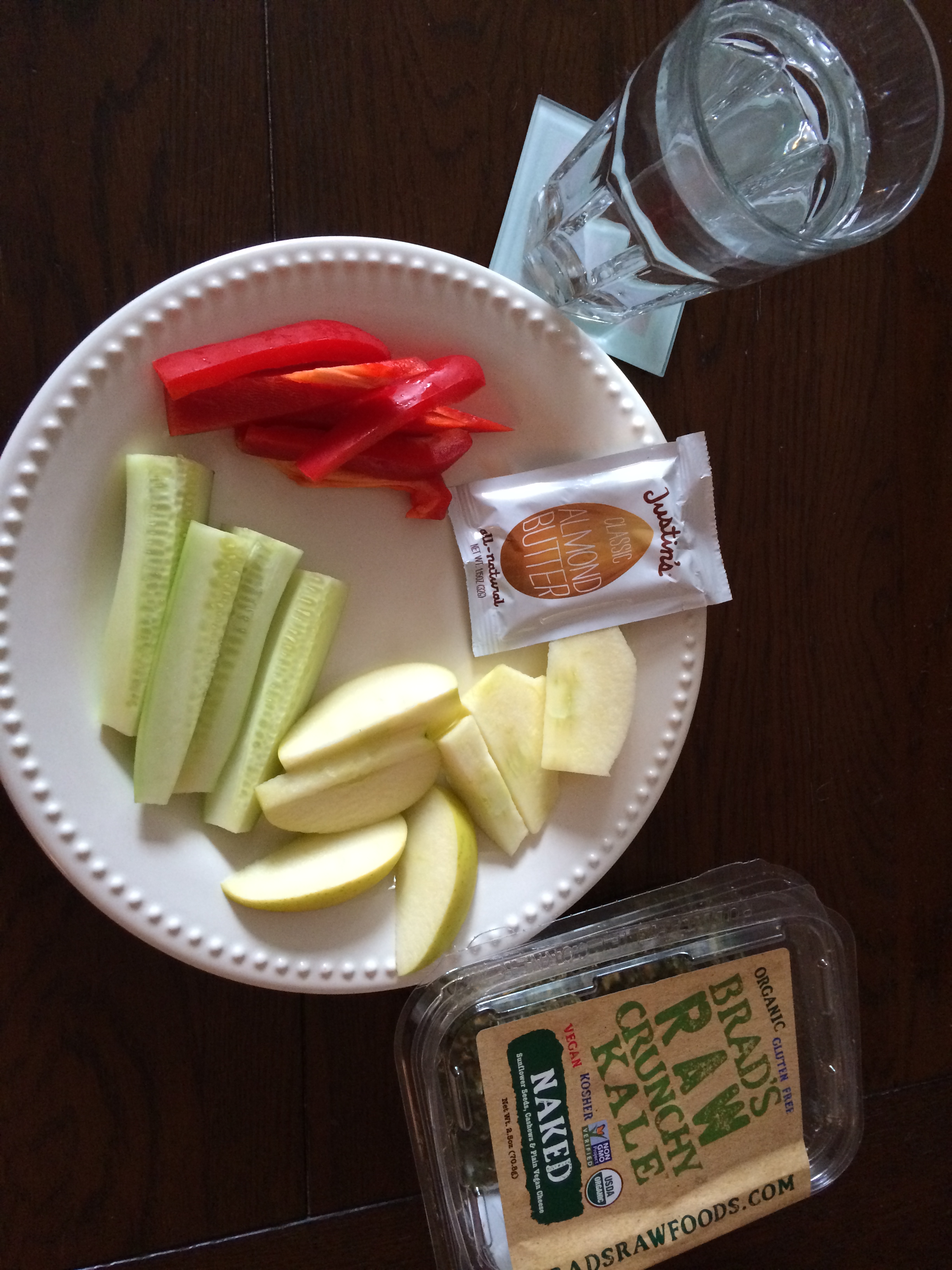 Red peppers, cucumber, Figi apple with Almond butter and raw kale chips.