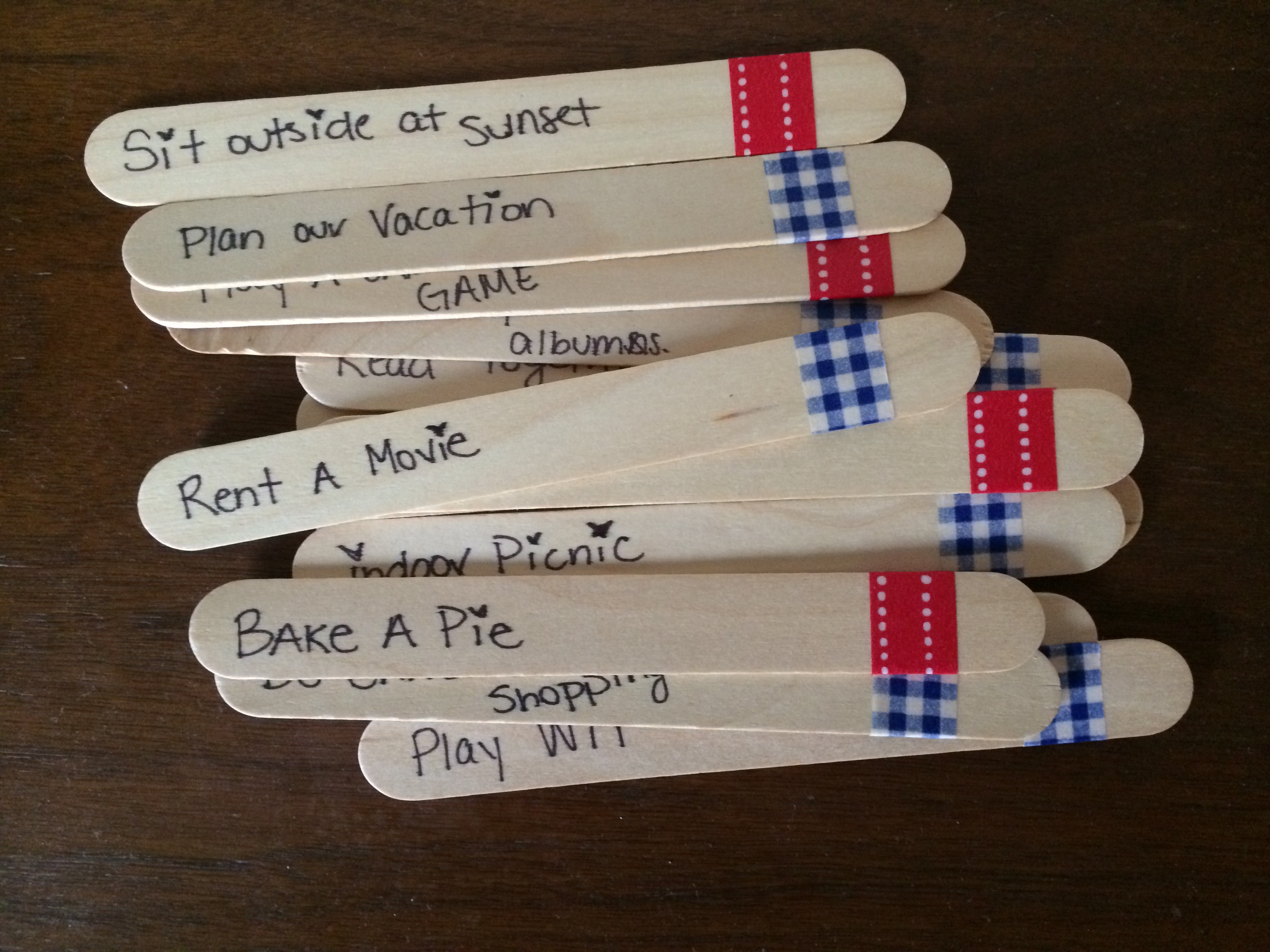 Many women, whether they are infertile or not, go through the glorious time period known as the two week wait. It’s hard to keep your mind off of the impending day (Friday) when we will go take a blood test to determine if we are pregnant or not. We decided to take the planning of keeping busy out of our hands and turn it into a little game. We wrote activities on popsicle sticks and when we were bored or stressed we picked one out and did whatever it said…