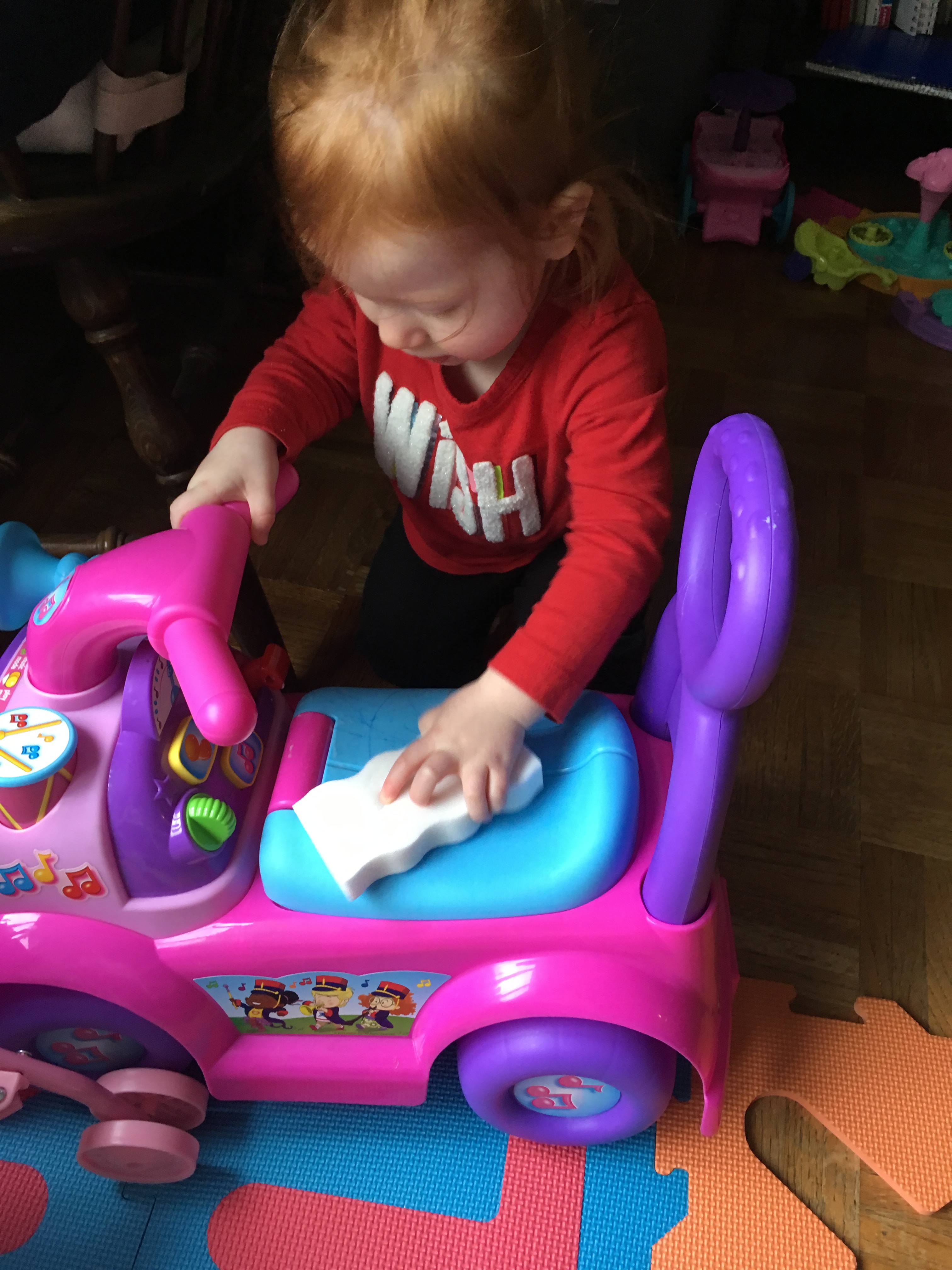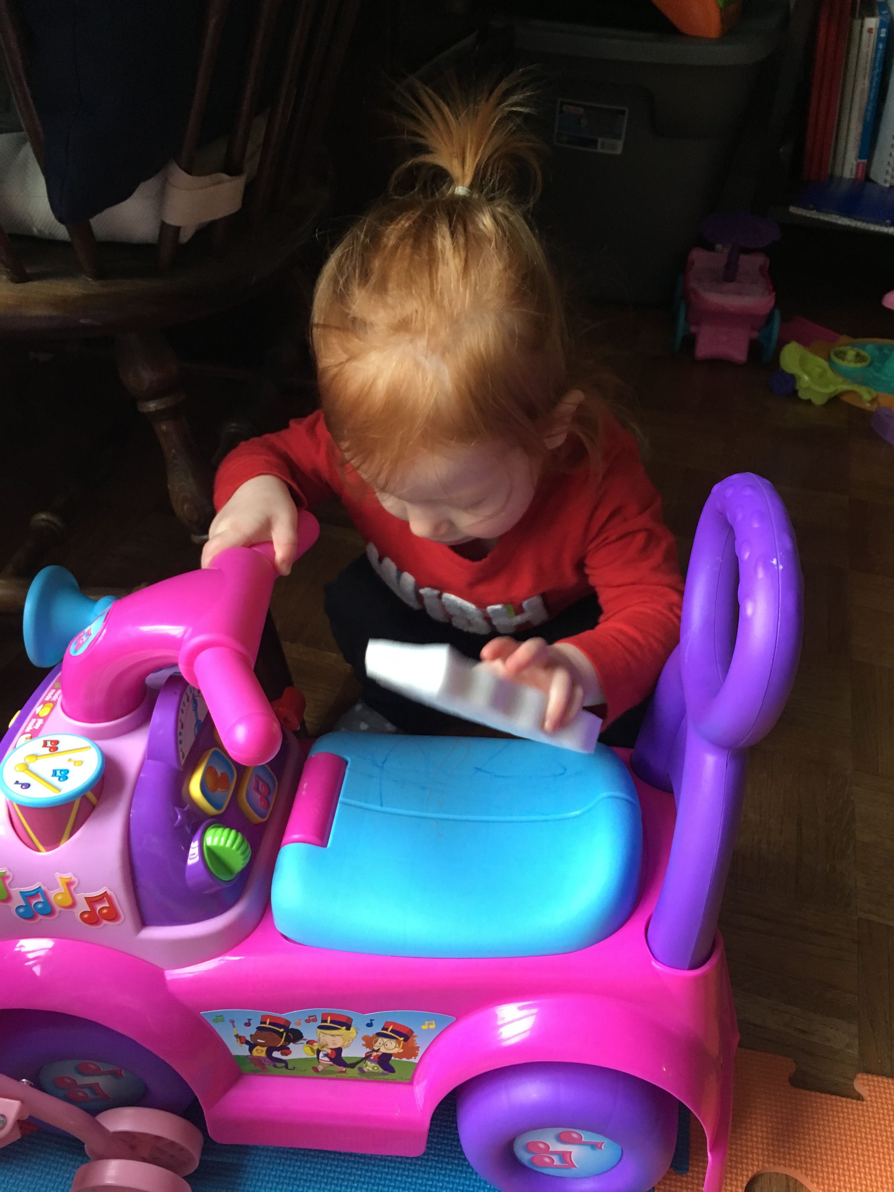 I told you last week she loves to color so much we are working on coloring paper and not walls and furniture. Sunday afternoon we spent some time cleaning the walls and toys that she has decorated.