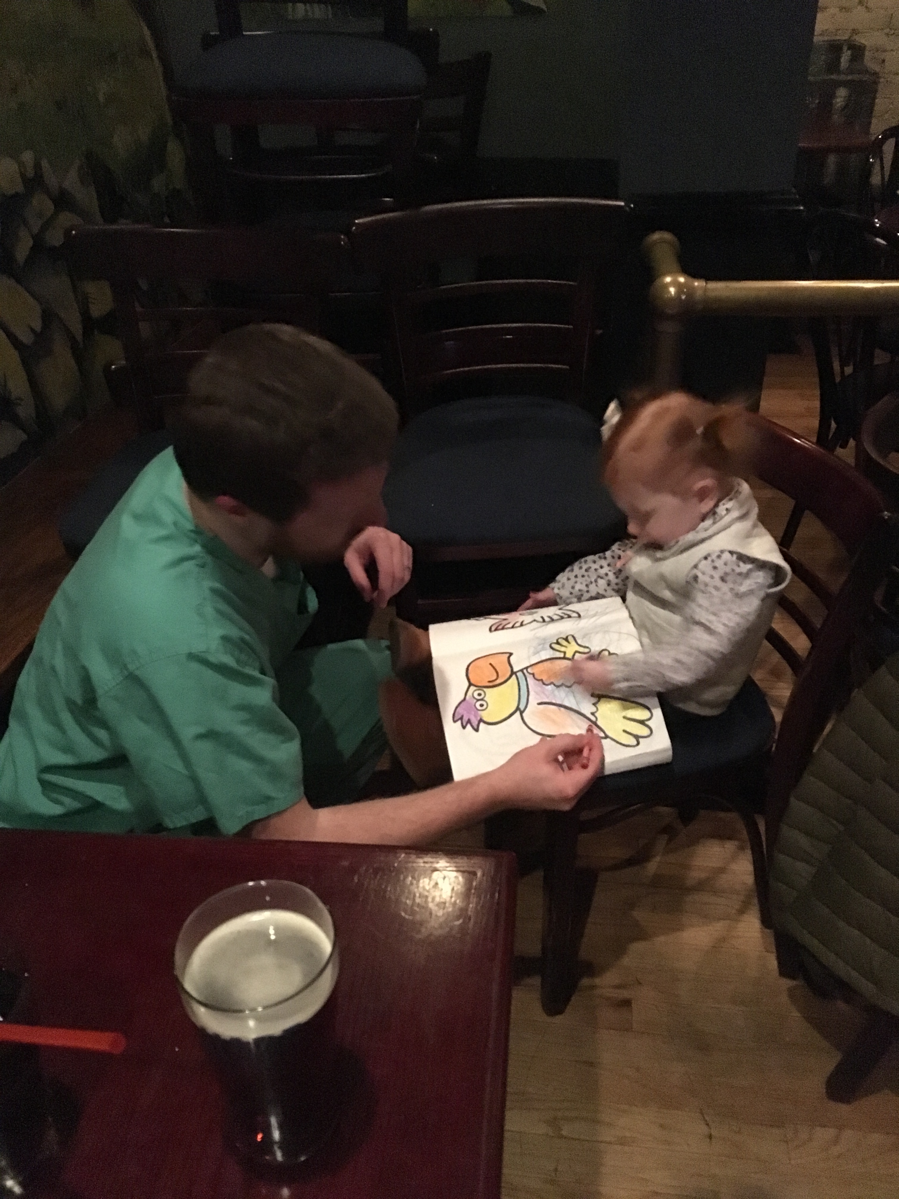 Mike had to take his last Absite exam for residency this past weekend! Woohooo! It’s just one more step to us being done with residency. To celebrate the residents get together every year after the test and this year we brought the kids…to the bar.